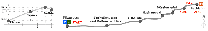 Die Wanderung über die Filzwiese zur Bachlalm beginnt in Filzmoos kurz oberhalb des Dorfzentrums beim Intersport Flory. Links neben dem Geschäft geht es der Straße entlang leicht aufwärts bis zum Buschhäusl. Von Filzmoos und einem Teil der Wanderroute kann man einen herrlichen Blick zur Bischofsmütze geniessen.